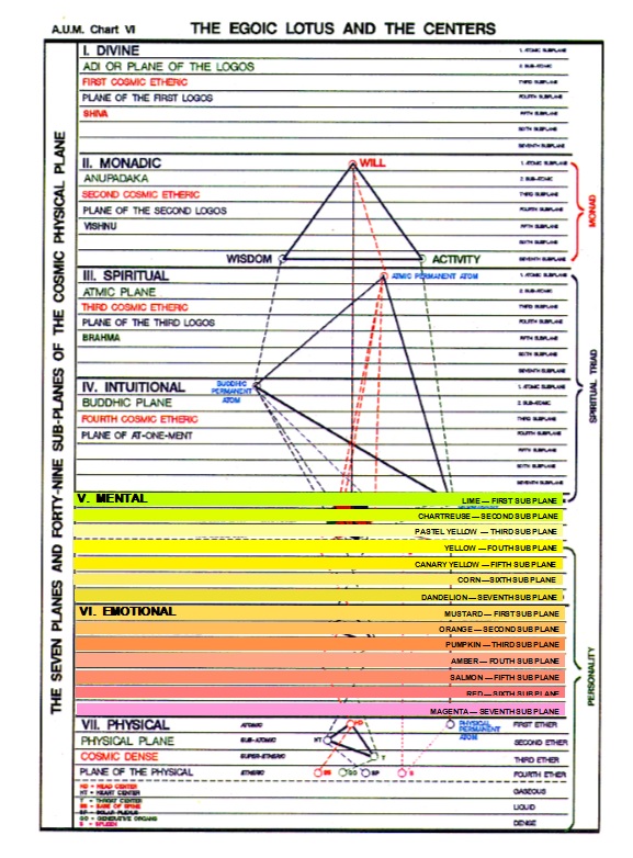 When I first started learning about the Ageless Wisdom teachings in the mid 1980’s, I was shown the chart similar to the one below that comes from the Alice Bailey teachings. If you notice within the section of the mental plane, there is a dotted line just under the words “Cosmic Gaseous” and to the right the words “Third Subplane.”