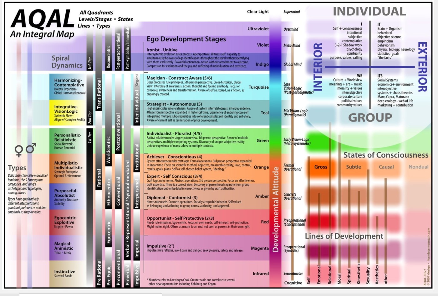 Next you have the Integral quadrants, that represent four ways each level can be applied. For example, it can be applied in terms of individual interior experience; individual exterior experience; group interior experience; and group exterior experience. To give you an example: 1) “I.” This is how I experience my interior sense of self; 2) “IT.” This is how my interior sense of self manifests itself in an exterior way such as in my brain; 3) “WE.” In this quadrant is how a group who has reached the same level of consciousness as me comes to perceive the world from their interior understanding; and 4) “ITS.” This quadrant reflects how that group then exteriorly creates the world into the image of how they perceive it should be.