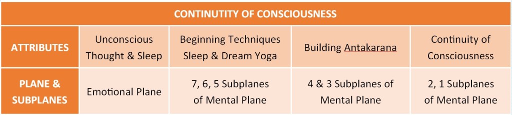 As we move onto the Mental Plane, especially as we get into the Plane of the Solar Angel (the three higher subplanes of the Mental Plane), this lack of continuity has to increasingly shift. One practice that assists in building continuity of consciousness is learning to fall asleep in a more conscious way. In modern terms this is known as sleep yoga where we learn to fall asleep with more intention. We also practice dream yoga where we become more conscious of our dream life and more capable of learning from our dreams. We can even begin to practice lucid dreaming and become awake in our dream state. These practices, sleep yoga, dream yoga, and lucid dreaming were around in Bailey’s time, but she does not mention them specifically. She does emphasize going to sleep in a conscious way especially by setting the intention to contact your “ashram” (spiritual group) while in the sleep state and being open to bringing back any “lessons” you have learned from your ashram back into your waking state (See Discipleship in the New Age, pp. 284—285 for one such example of this).