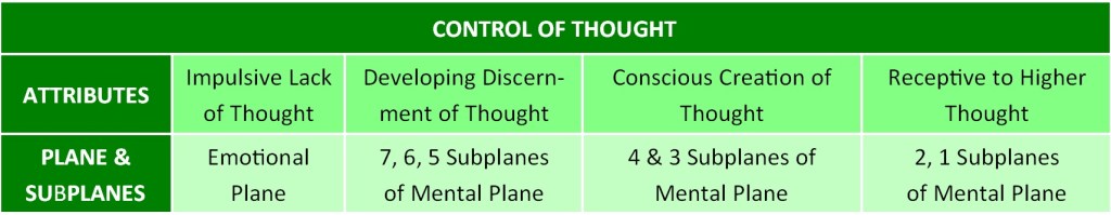 Eventually as discernment continues to increase on the 4th and 3rd subplanes of the Mental Plane the individual has an increased capacity to more consciously choose what kinds of thoughts, ideas, and belief systems she/he will be impacted by. There is also a greater recognition that what we think and what we say shapes who we, and even others, become. Mahatma Gandhi conveyed this when he said, “Your beliefs become your thoughts. Your thoughts become your words. Your words become your actions. Your actions become your habits. Your habits become your values. Your values become your destiny.” Spiritually then, we take increased responsibility for our speech and even our very thoughts. As we become a conscious creator in the realm of thought, Bailey claims we become a “white magician.” That phrase, “white magician” may seem odd, archaic and even politically incorrect in our time. But, one hundred years ago, when Bailey used the term, it was meant to indicate a person who was learning to recreate or reshape his or her thoughts, emotions, vital and physical bodies to better reflect the Soul, or Self.