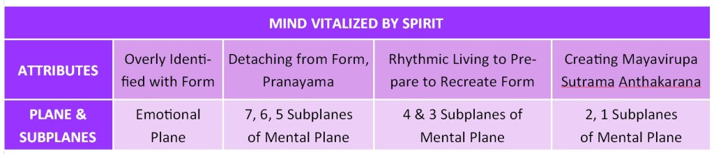 Finally, we come to the last of the main categories I have put together based on a compilation from Bailey’s writings regarding the Mental Plane. This category, which I have titled “Mind Vitalized By Spirit” is perhaps the most audacious one. For this reason I will not say too much about it here, though I will attempt to do so in future books. Essentially, this process involves learning how to vitalize not only the physical and emotional bodies, but the mind itself by the pranic essence of Spirit or “God.” This allows us to increasingly spiritualize our mental, emotional, vital, and even physical worlds. On the lower subplanes of the Mental Plane the initial phase of this process is one of increasingly recognizing that the mind (or consciousness) is not the body. By learning to become the Witness or Observer one can shift the focal point of consciousness out of the body into the realms of consciousness. No longer dominated and controlled by bodily impulses we can instead learn to consciously control and even recreate the various bodies (mental, emotional, vital, physical) themselves. In yogic terms we master the senses, instead of the senses mastering us.